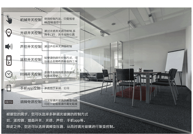 公司自行研发和引进国内外用于加工智能液晶调光膜的优秀设备,包括贴合设备、固化设备、切割设备等,建立超高洁净度的生产环境,产品生产过程高效、环保、可控。采用先进技术工艺加工智能液晶调光膜,并为用户提供液晶调光玻璃产品。我们的智能液晶调光膜光学性能、开关态对比度高、能源消耗低,产品性能优越,品质稳定,可广泛运用商业、住宅、办公室、医院、酒店、广告投放等建筑材料和显示投放领域。 如水将继续秉持:“诚信、高效、学习”的企业理念,进一步拓宽市场,寻求更多合作伙伴,为广大智能液晶调光膜/玻璃用户提供高品质产品,以综合性解决方案和迅捷的服务体系让更多人了解液晶膜、调光玻璃产品,为推进行业的科技进步而努力。