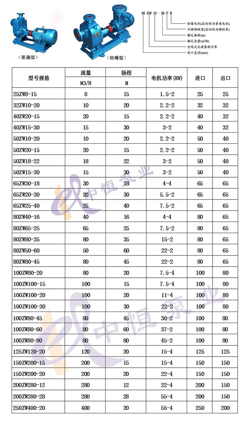 ZW型无堵塞污水自吸泵 该泵集自吸和无堵塞排污于一体,采用轴向回流外混式,并通过泵体、叶轮流道的独特设计,即可象一般自吸清水泵那样不需要安装底阀和灌引水,又可吸排含有大颗粒固本和长纤维杂质液体可广泛适用于市政排污工程、河塘养殖、轻工、造纸、纺织、食品、化工、电业、纤维、浆料和混合悬浮等化工介质理想的杂质泵。具有结构简单、自吸性能好、排污能力强、高效节能,使用维修方便等待点,在排污泵系列产品中属国内首创。各项技术性能指标居国内,达到国际先进水平,具有广阔的应用市场和发展前景。采用进口高于叶轮设计,启动时将吸入管内空气排出,池内液体受大气压力进入泵腔由叶轮离心力将其排出,高吸程可达4.5M。启动灌液后无须再次灌液,真正实现“一次引流终身自吸”。排污能力强,无堵塞蜗壳式流道设计,通过污物能力可达泵出口径1/2。泵轴可采用镀铬、碳氮共渗等处理手段增加硬度及抗磨性能。独立轴承座设计,油室内装有2-3个滚珠轴承,运行平稳,性能。