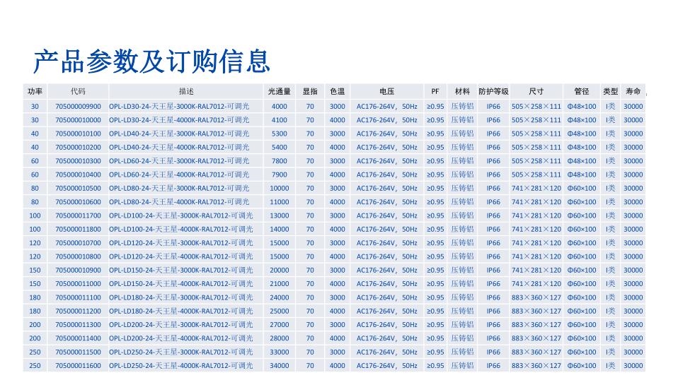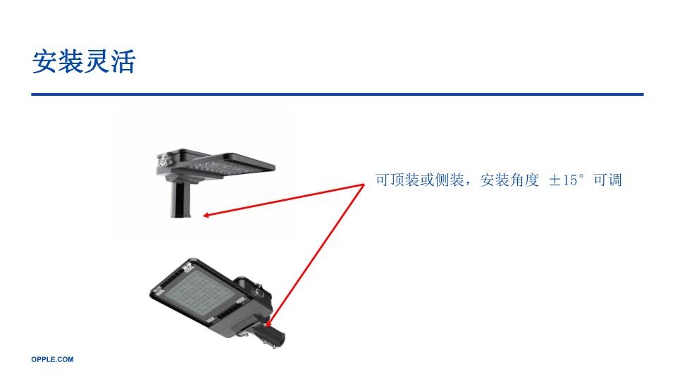1.设计特点,外观流线型,简洁大方,灯体不易积灰,自清洁免工具开启电器腔,维修更安全、方便可顶装或侧装,安装角度 ±15°可调。