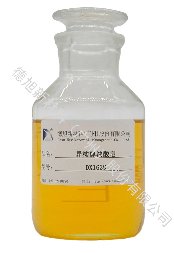 异构醇油酸皂 DX1639是一种长碳链烷基酸异构多醇胺皂类有机化合物,易溶于水,适用于除蜡水、除油剂、金属加工液等领域,具有除油除蜡去污快速彻底、渗透润湿能力强、配比浓度低、持效时间长、防锈效果好等特点。