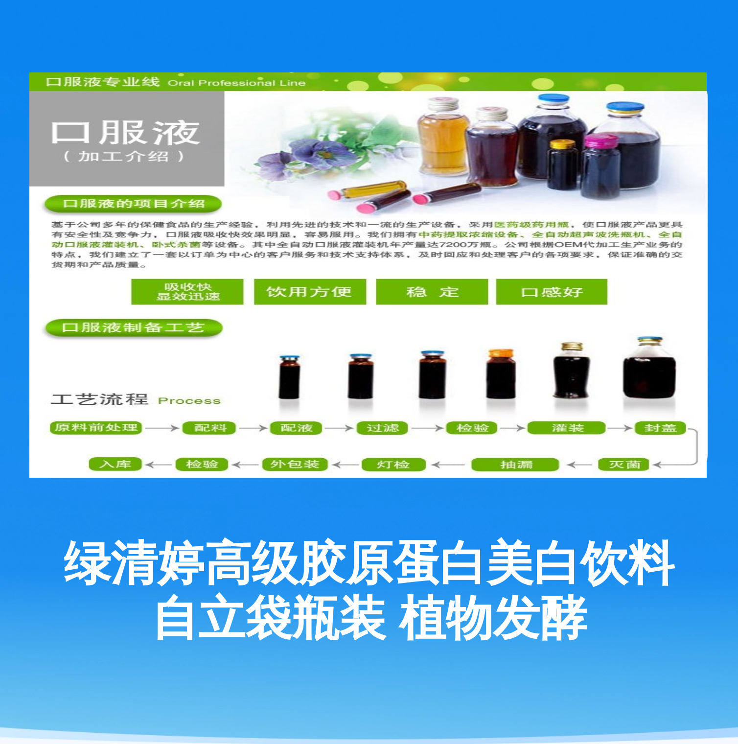 绿清婷高级胶原蛋白美白饮料 自立袋瓶装 植物发酵