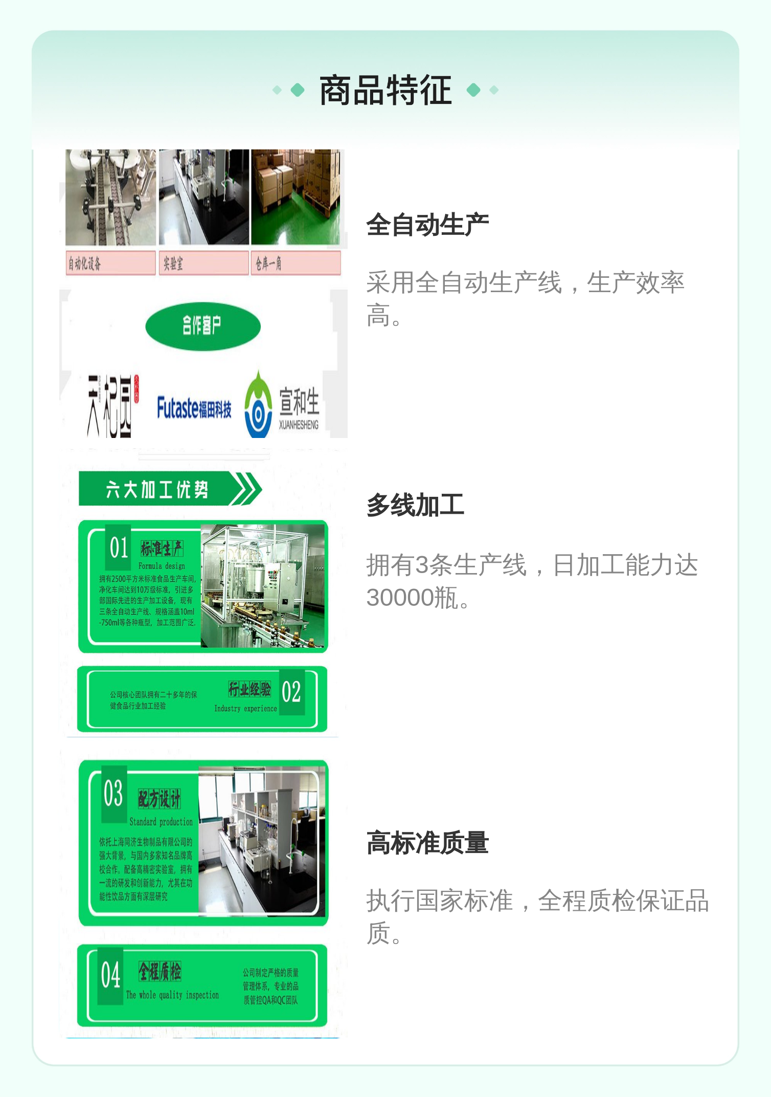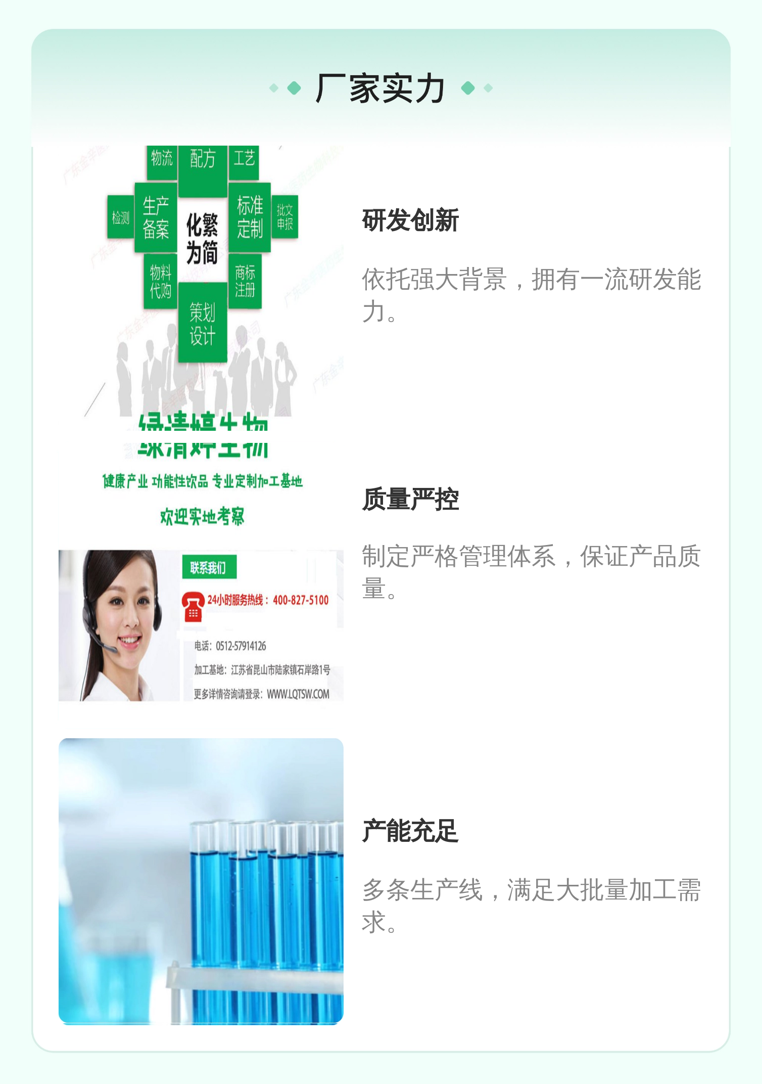 标准生产、行业经验、配方设计、全程质检等六大优势 |