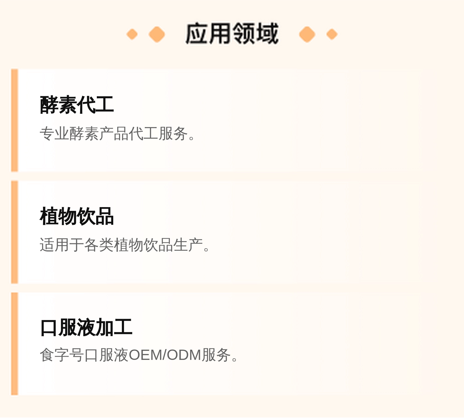 复合果蔬饮品、功效型植物饮料、益生菌饮品、各种食字号口服液等 |