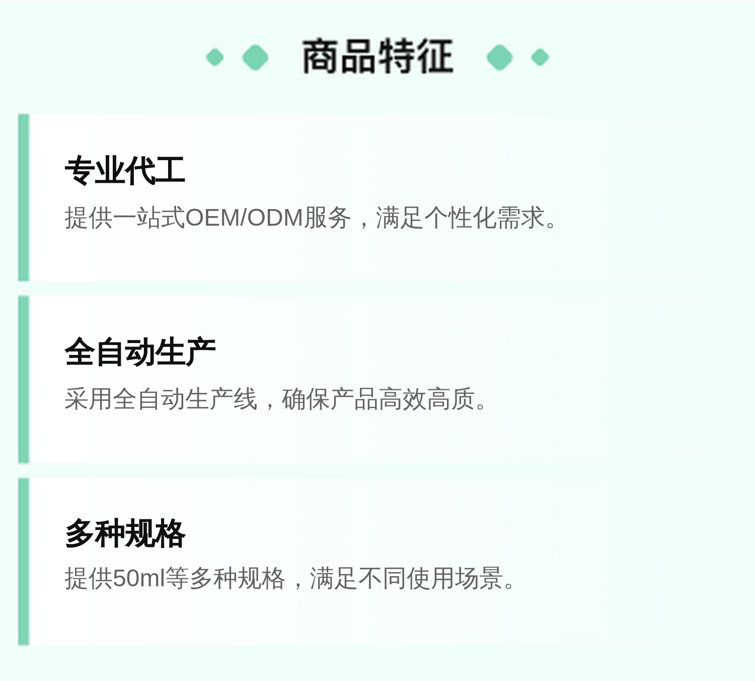 接单洽谈、材料监测、打样、合同签订、包装设计、配方研发、产品打样、确认样品、清洁消毒、签署加工合同、产品包装入库 |
