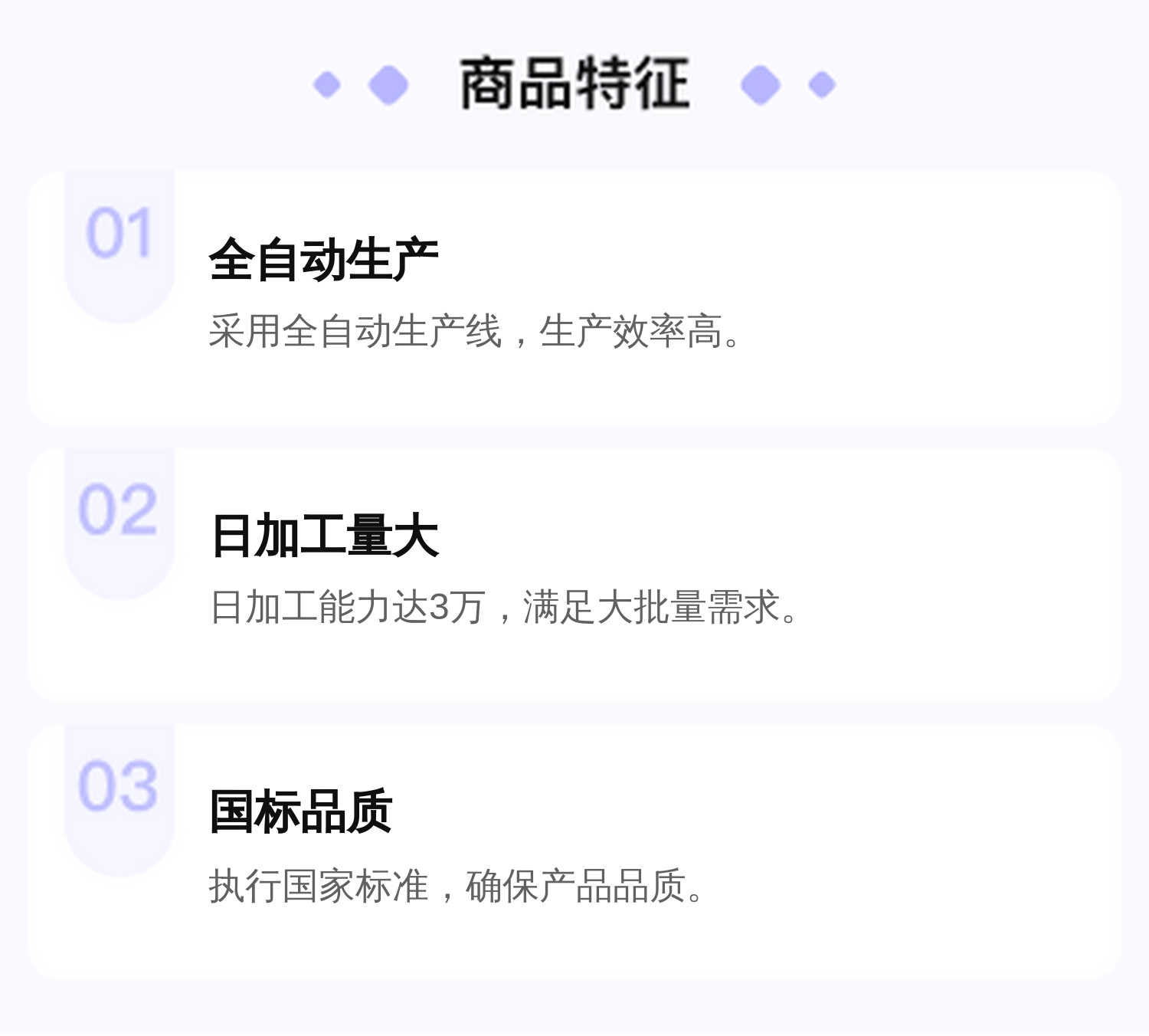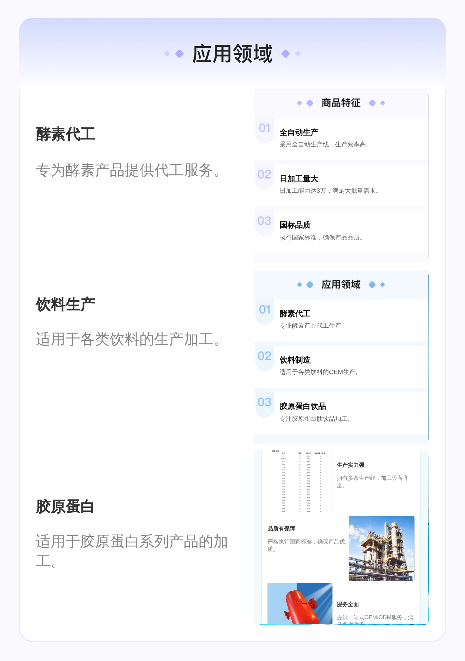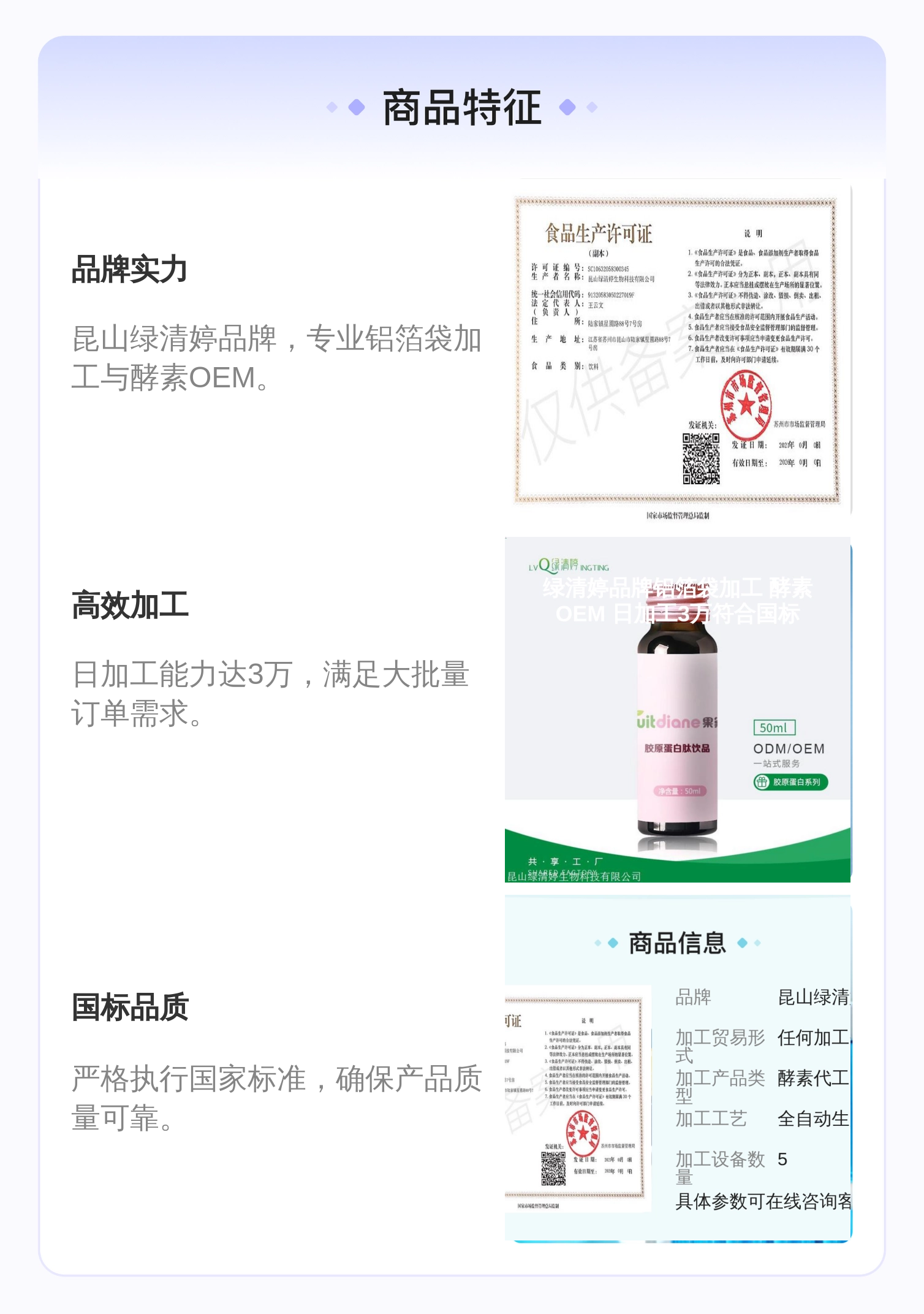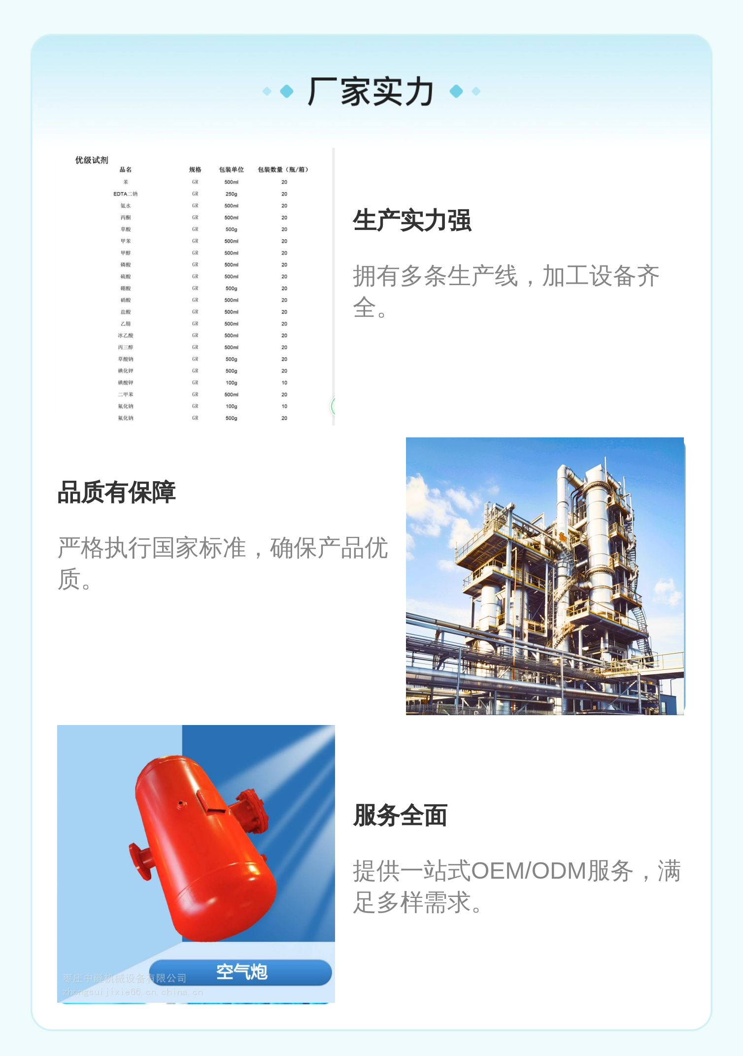 标准生产、行业经验、配方设计、全程质检等六大优势 |