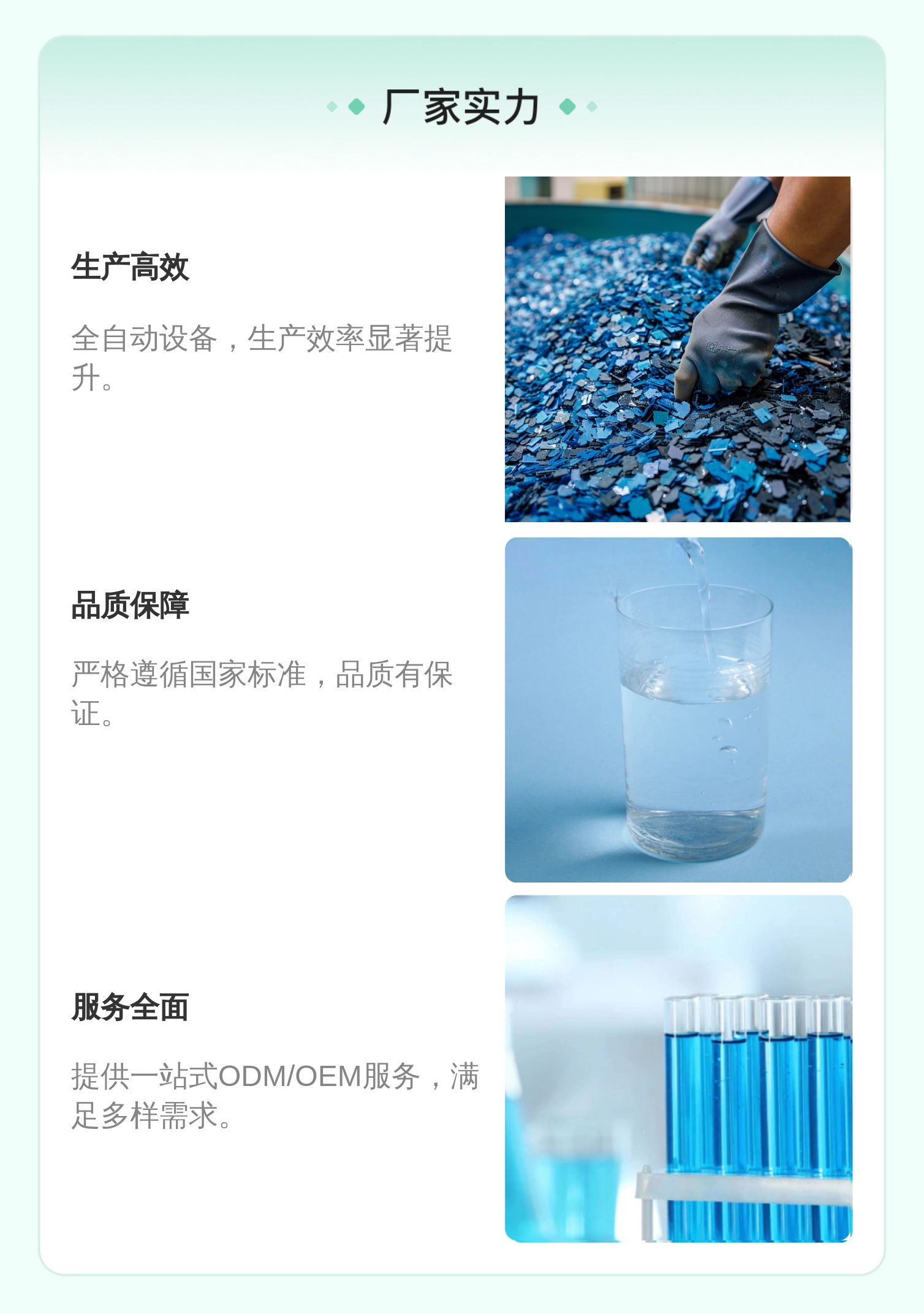标准生产、行业经验、配方设计、全程质检等优势 |