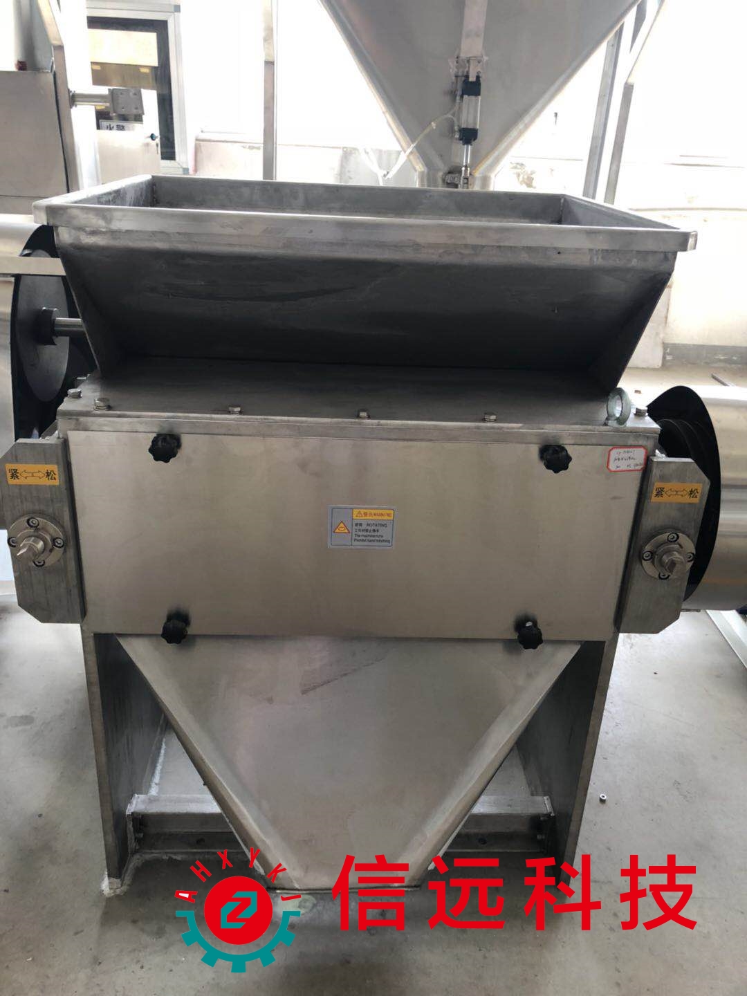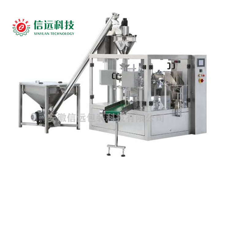 全自动包装机组是广泛运用与食品、药品、化工、饲料等行业的自动包装专用机型。该包装生产设备凝聚我公司多年来在自动包装行业的成功技术经验,汲取大量用户的宝贵意见建议,不断完善更新并批量生产的达到国内先进水平的全自动粉料包装生产设备。该机具有计量精度高,包装速度快,无粉尘污染、封口平整无夹粉、袋型美观等特点。亦可选配排气、冲孔等装置实现手拎袋自动制作等功能。针对易扬尘物料可选配可回收除尘系统。 XYG-F机组 机组设备包装工艺流程: 待包装物料投加至DT3螺旋提升机料仓(含振动防架空破拱装置)----------提升机自动提升物料(受计量螺杆料仓料位控制)--------CJSL5000计量螺杆按设定重量自动计量充填---------XY系列自动包装机自动制袋成型-------- 包装机完成自动封切--------成品包装经成品输送机输送至人工装箱工位 技术参数: 包装物料:均匀细颗粒、无粘性粉体物料(生物肥、饲料、添加剂、奶粉、农药等物料) 包装速度: 20~40包/分(视物料状态及包装重量) 计量范围: 100~2000g 制袋尺寸: 长(100—450)x 宽(80~380)mm (XY-800机组) 计量精度: ?0.5~2 压缩空气: 0.6Mpa 0.65m3/min 允许大包材外径: Φ400mm 卷材纸芯内径: Φ75mm 机器重量: 800Kg 电 源: 5.5Kw 380V?10 50Hz 袋 型: 背封袋 包装膜材料:复合膜(单膜) 机组配置: ?标配设备 XY-800立式制袋包装机 1台 CJSL5000立式螺杆计量机 1台 DT3螺旋提升机 1台 XY-S1成品输送机 1台 料位控制装置 1套 设备组成说明: 1、CJSL5000立式螺杆计量机 该机可自动完成均匀颗粒、粉体物料的计量、充填包装。适宜颗粒、粉粒状如兽药、粉粒状添加剂、白砂糖、棉白糖、葡萄糖、味精、固体饮料、固体医药、碳粉、爽身粉、染料、香精香料等物料的计量包装。伺服电机驱动计量螺杆,配备同步反向搅拌混合确保高速高精度计量;破分式料仓结构,可快速更换螺旋附件及清理残留物料。针对