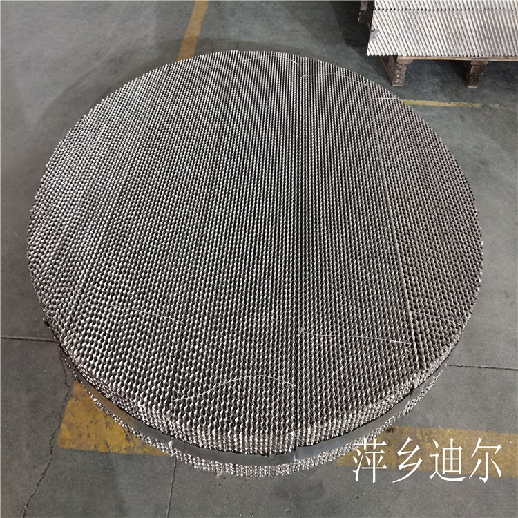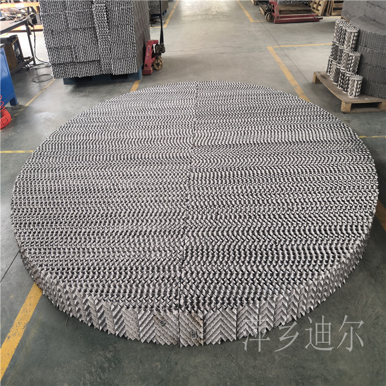 金属孔板波纹填料是由若干波纹平行且垂直排列的金属波纹片组成,波纹片上开有小孔,波纹顶角约900度,波纹形成的通道与垂直方向成45度或30度角度。相邻两波纹片流道成90度,上下两盘波纹填料旋转90度叠放,在直径较小用法兰连接的塔内,波纹填料做成一个个整的圆盘,直径略小于塔的内径。在直径较大的塔内,每盘波纹填料分成数块,通过人孔放入塔内,在塔内拉拼成一个个完整的圆盘,上下两盘填料的波纹片旋转90度安装,使流体在塔内充分混合。
