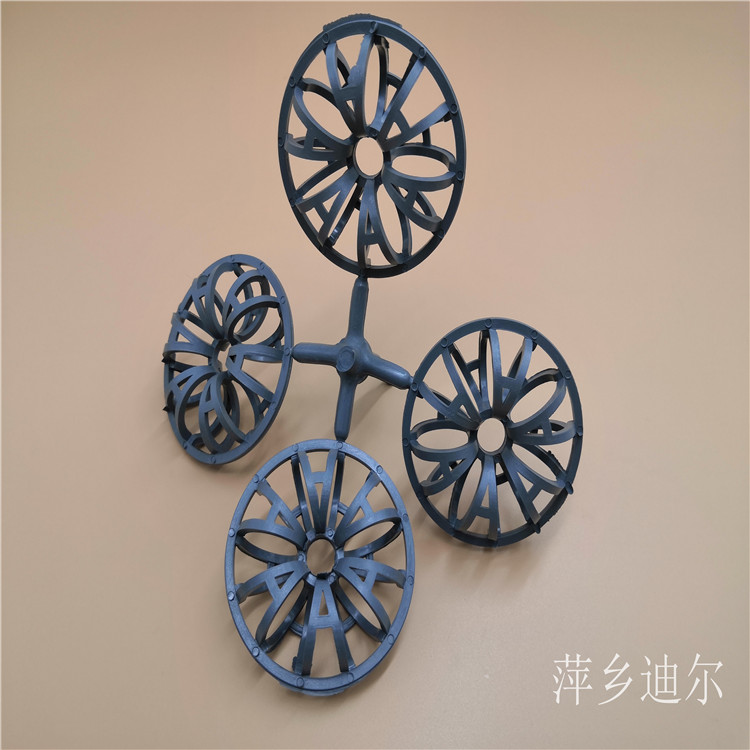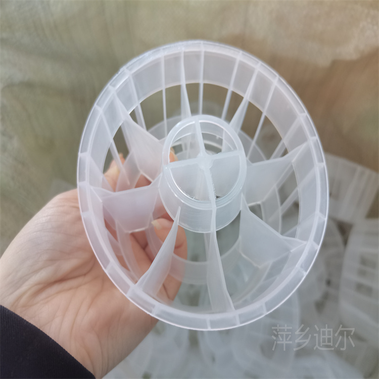 江西省萍乡市迪尔化工填料有限公司生产的多面空心球是由塑料制成球状,由两个半球合成一个球形,每个半球上开有12个半扇形叶片,两个半球的扇形叶片相互错开。该填料特点是比表面积大,空隙率较高。但是由于叶片数偏多,彼此间有遮蔽效应,不利于液体分布和润湿;液体大多在球体空心柱聚集,阻碍气体畅通,因此阻力较大。此种填料多用于水处理工程。原油减压蒸馏,高真空蒸馏,烯径分离,异构体分离,萃取蒸馏等。 特性:低压降,通量大,效率高,高的弹性,填料层内流体再分布性能好。